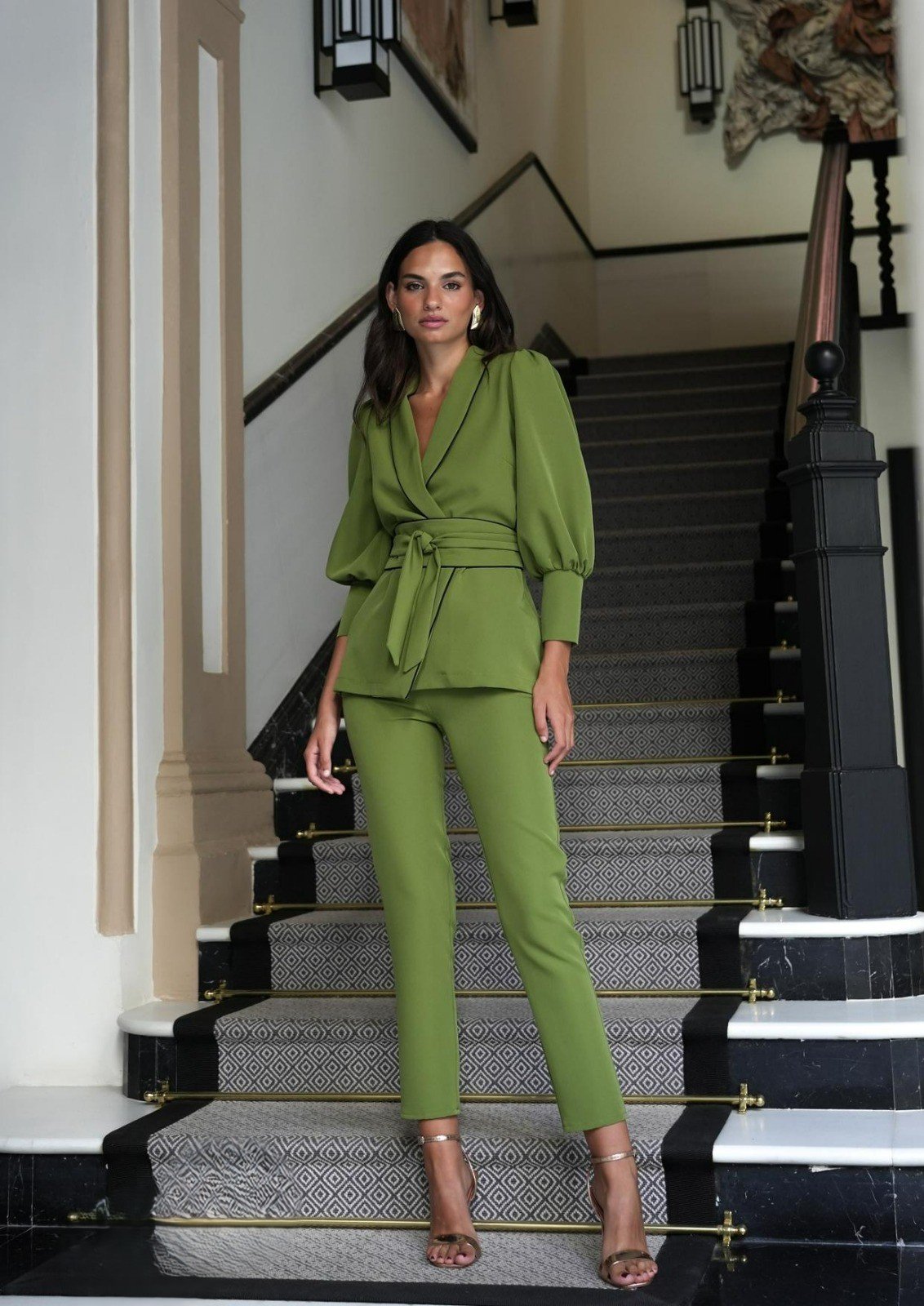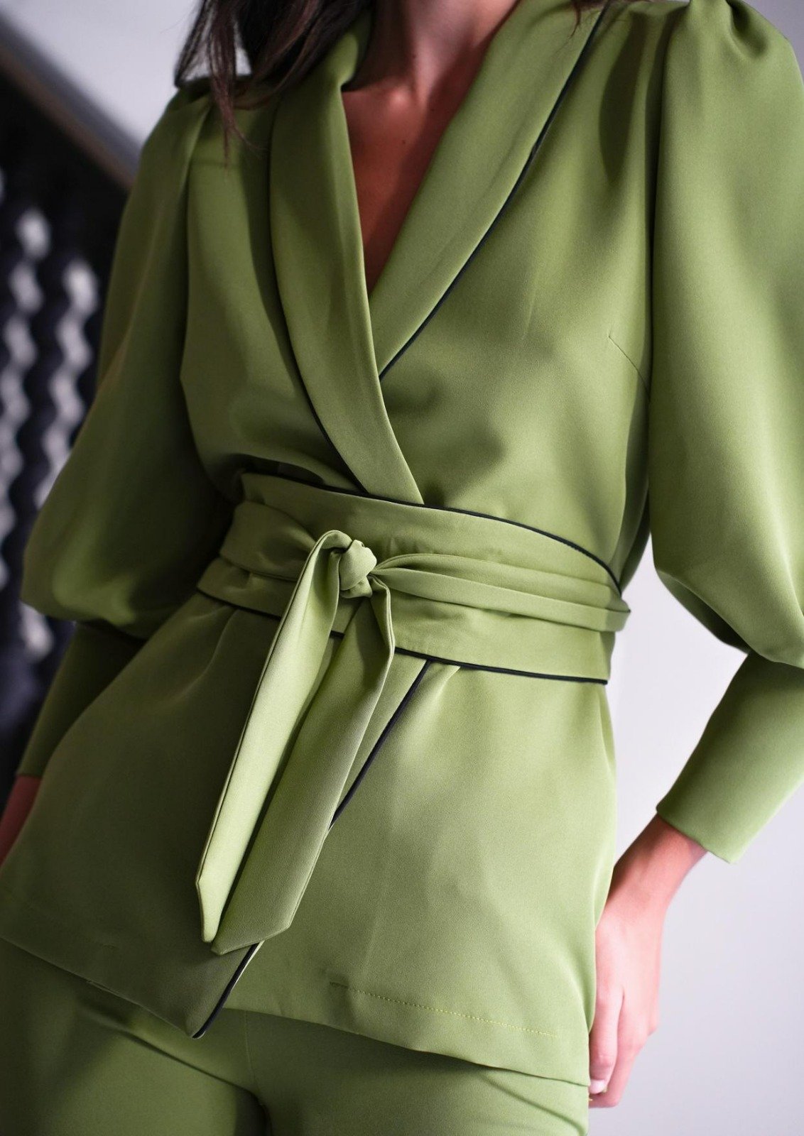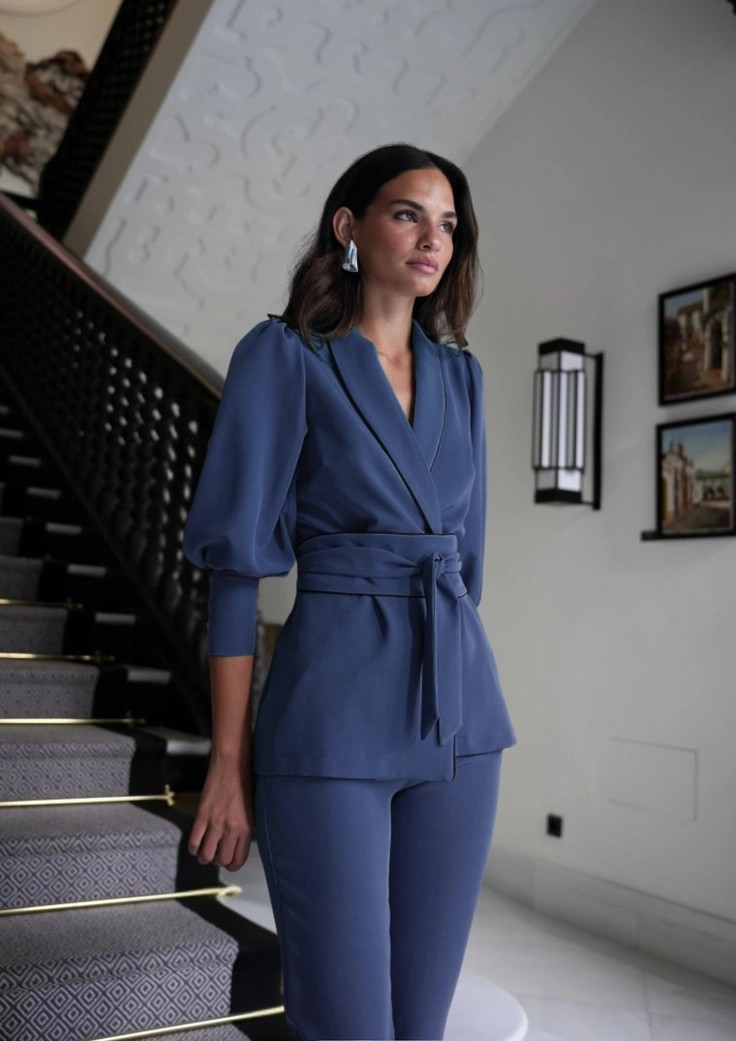 Casaco com manga bufante fechada no punho e calça de perna ajustada com fecho de correr invisível. Disponível em verde e azul.