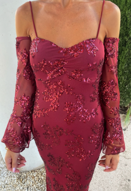 Vestido comprido de lantejoulas, com mangas e alças opcionais, o que permite usar o vestido de várias formas.
