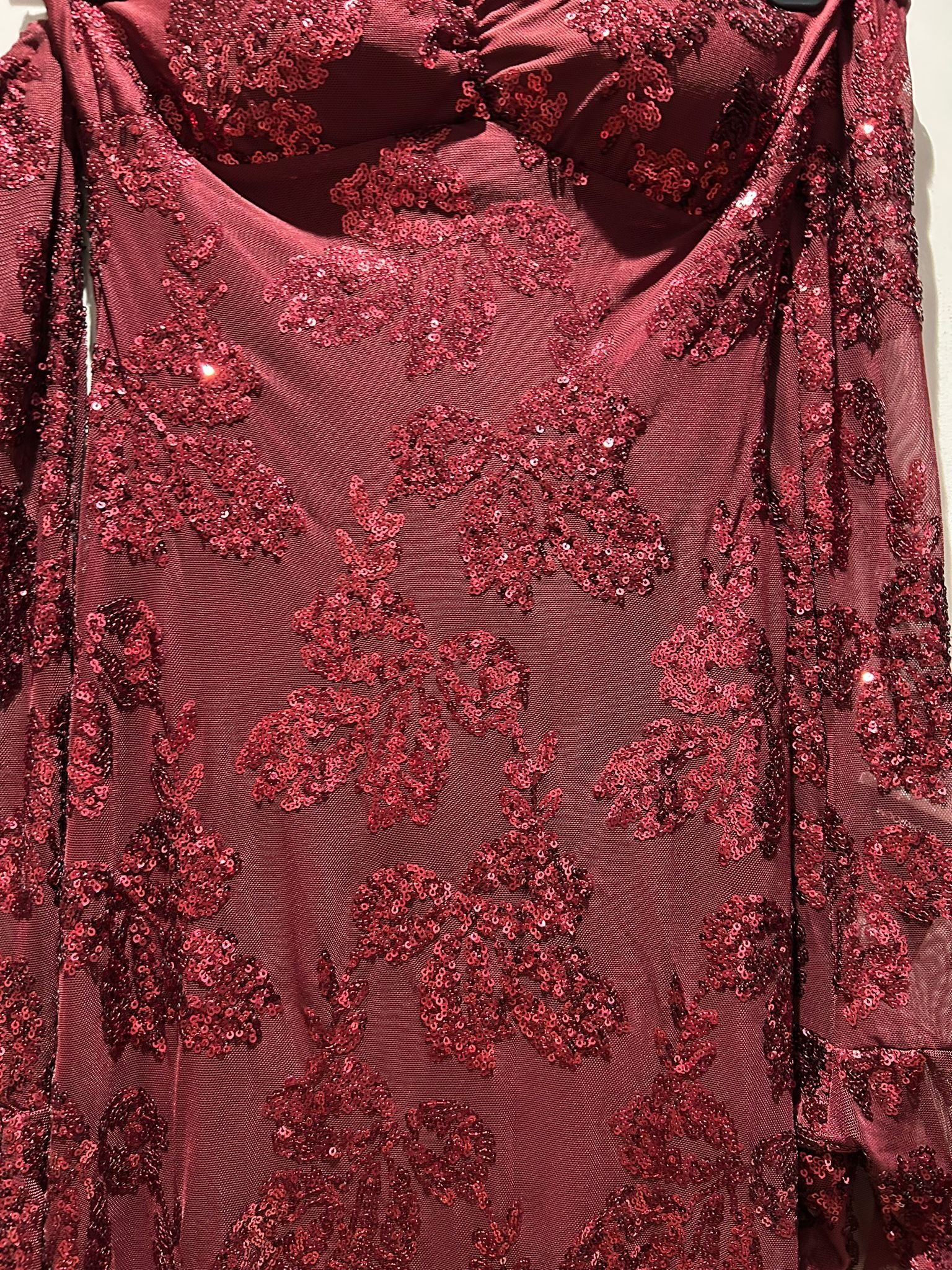 Vestido comprido de lantejoulas, com mangas e alças opcionais, o que permite usar o vestido de várias formas. Tamanho único